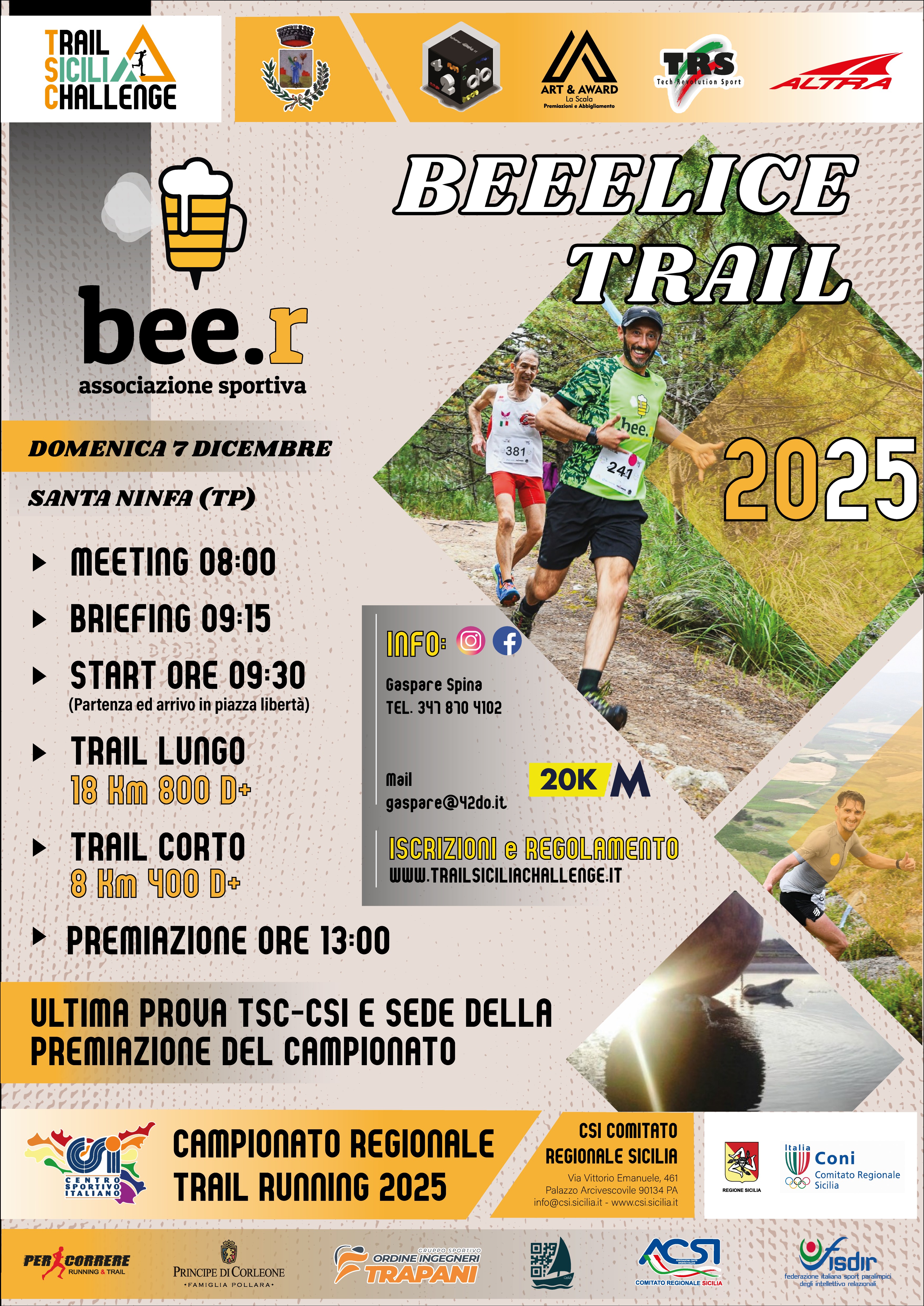 ASD BEE.R in collaborazione con il comune di Santa Ninfa ed il supporto delle associazioni PRO LOCO Santa Ninfa, Amici di Don Peppuccio, Sapori e Saperi organizza per il giorno 07 dicembre 2025 - 3^ edizione del BT 2025 - Beeelice Trail
